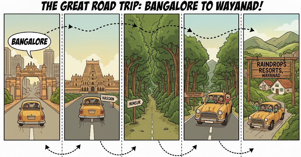 The most popular route is Bangalore → Mysore → Gundlupet → Sultan Bathery → Wayanad, as it offers smooth highways, scenic views, and easy access to northern Wayanad attractions. Other routes like via Hassan or Nanjangud are ideal for quieter or adventure-focused journeys.